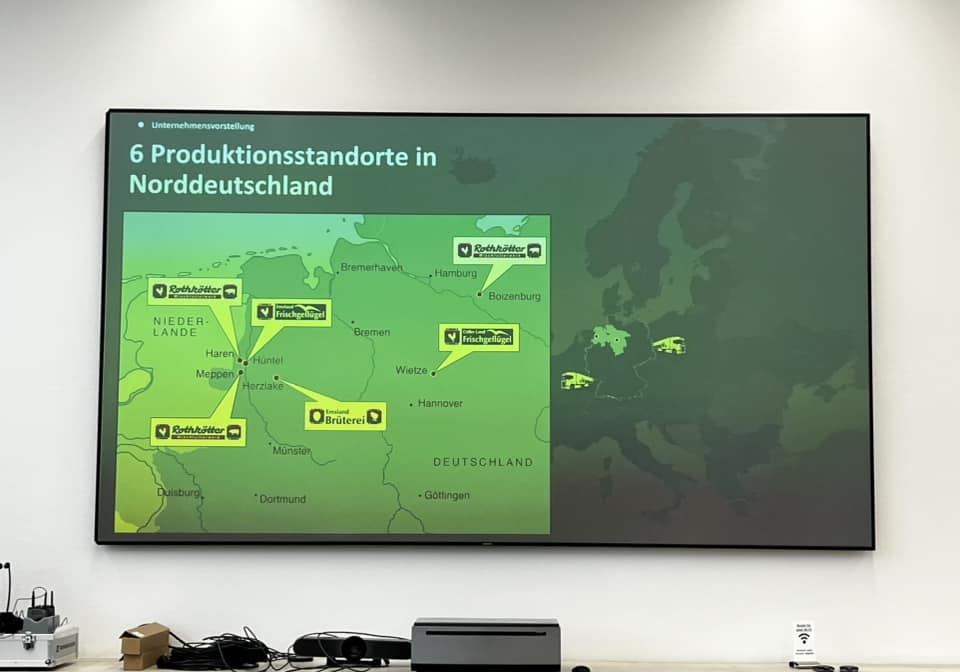 Nachdem wir einen beeindruckenden Vortrag über die Entwicklung vom kleinen Familienunternehmen bis hin zu einem der größten deutschen Unternehmen im Bereich Hähnchenfleischerzeugung, Verarbeitung und Vermarktung lauschen durften, folgte im Anschluss eine Führung durch das Unternehmen.